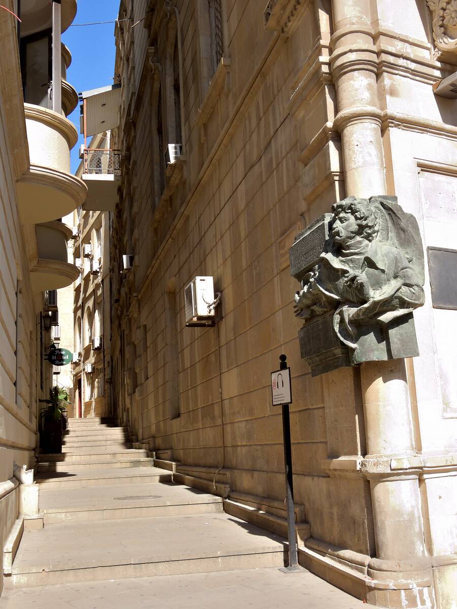 Unser Spaziergang führt uns weiter durch enge Gassen. Das ist die Vagif Mustafazade Dönge. An der Ecke befindet sich das Denkmal des berühmten Jazz-Pianisten und Komponisten Vagif Mustafazade.