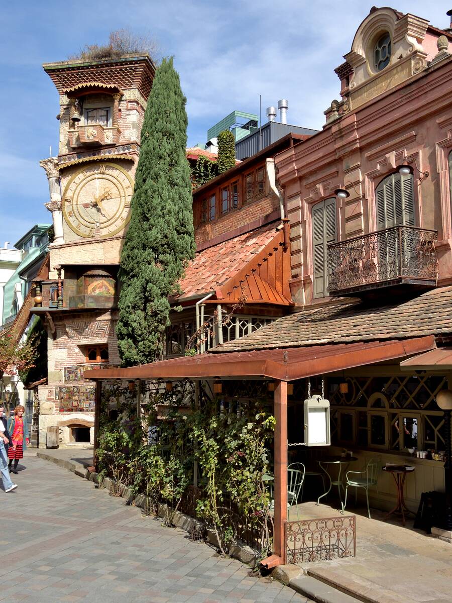 Der Uhrenturm des Rezo Gabriadze Marionettentheaters. Der Turm hat die größte und auch die kleinste Uhr der Stadt.