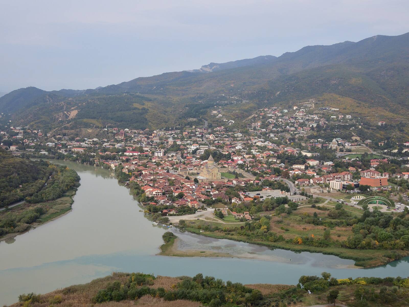 Das Kloster befindet sich auf einer Anhöhe. Im Tal vereinen sich hier die Flüsse Kura und Argwi. Blick auf Mzcheta.