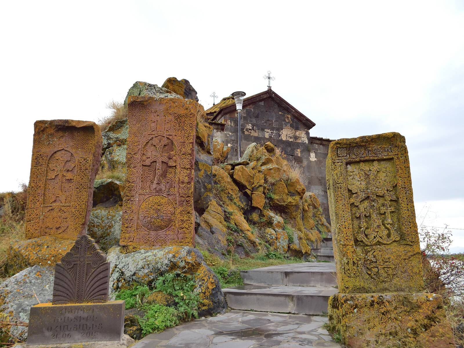 Rund um die Kirche stehen einige eindrucksvolle Chatschkare, kunstvoll behauene Grab- und Gedenksteine.