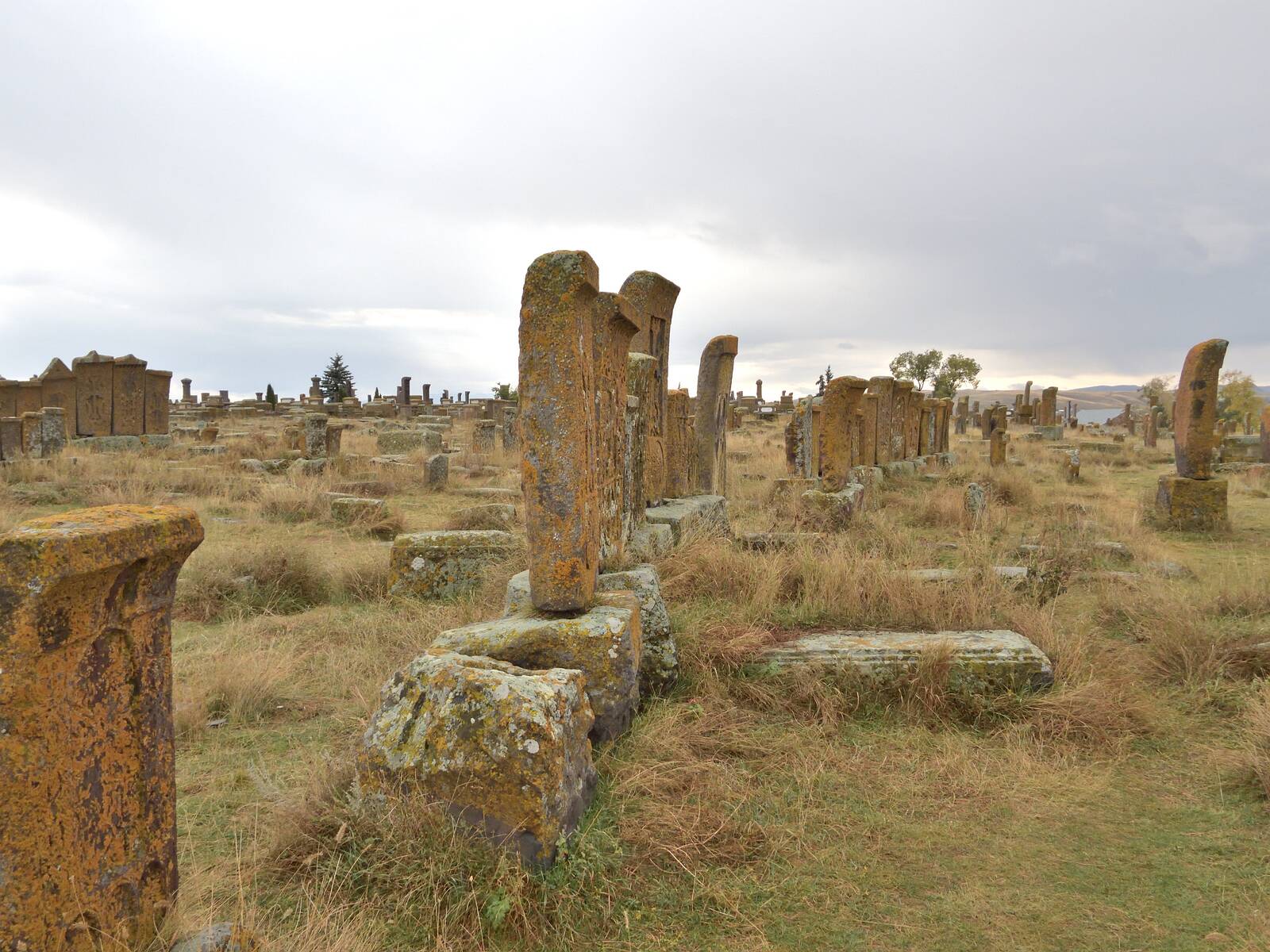 Mit seinen rund 900 Chatschkaren (Kreuz- und Gedenksteine) beherbergt der Friedhof das weltweit größte Chatschkarenfeld.