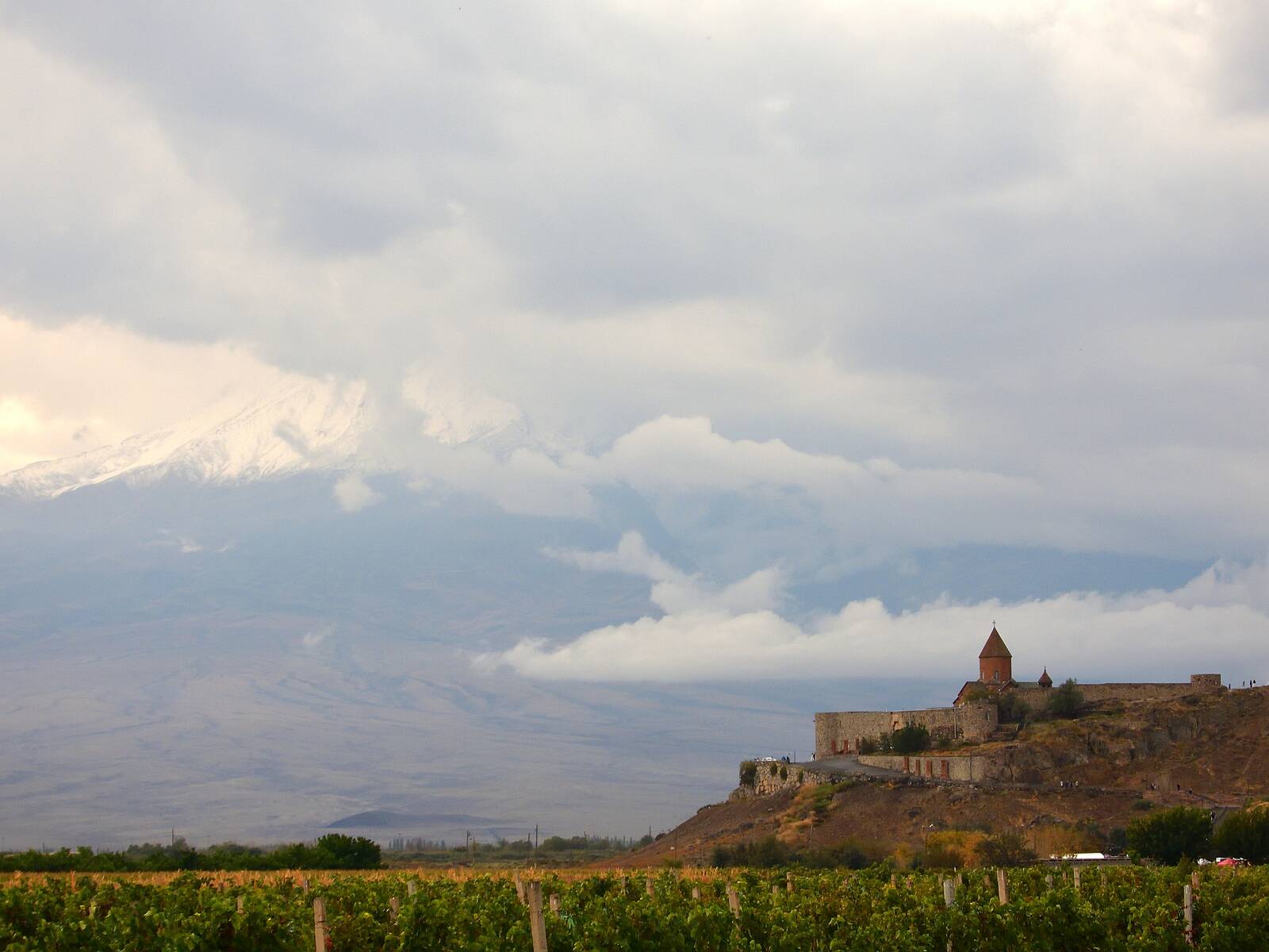 Hier kann man ihn erahnen. Rechts unser Ziel, das Kloster Chor Virap.