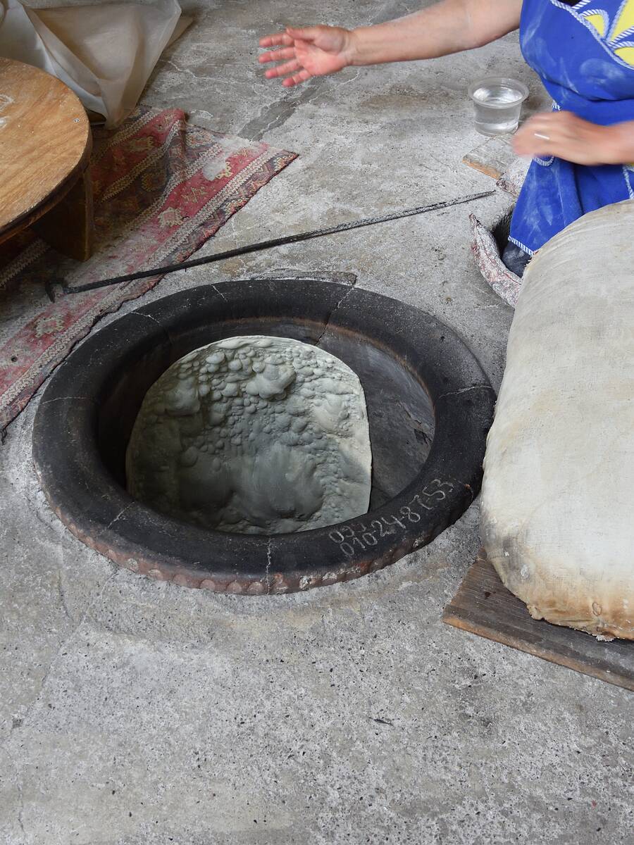 Dann in den mit Holzkohlen geheizten Ofen an die Wand klatschen.