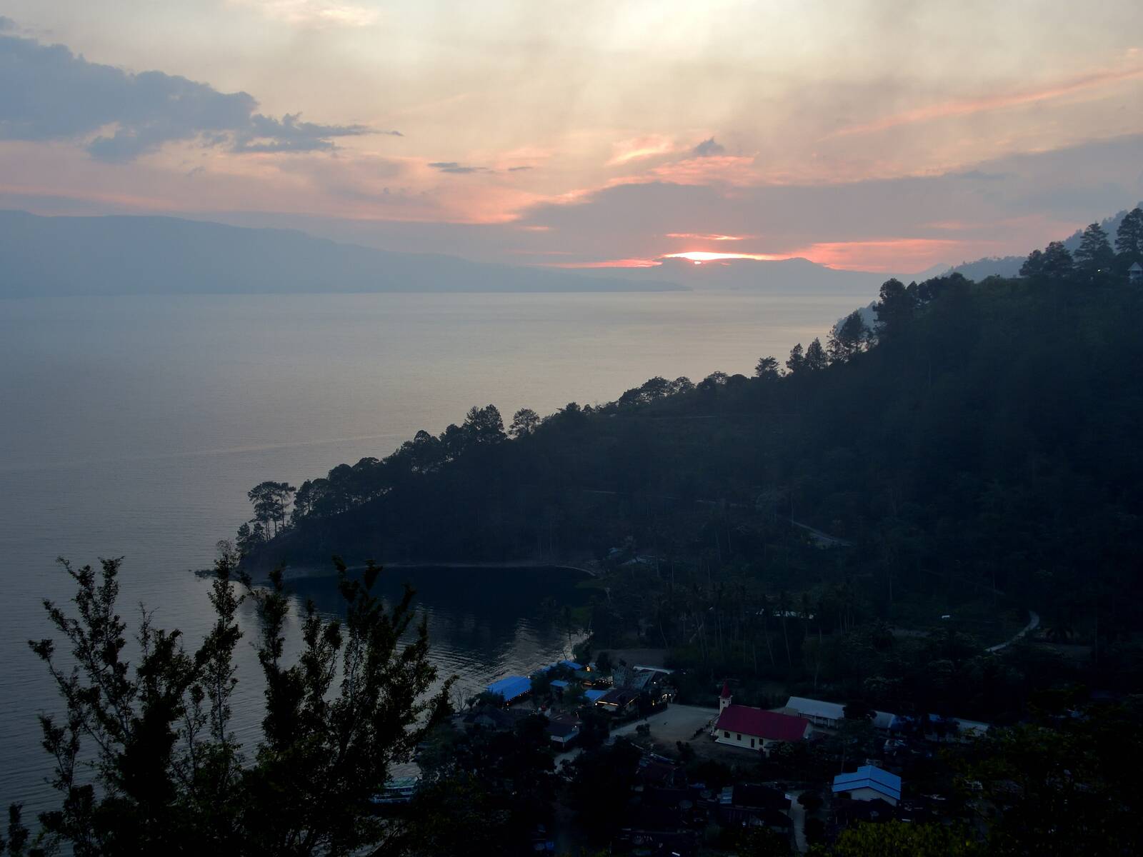 Ein kurzer Halt, um den Sonnenuntergang über dem Tobasee zu genießen.