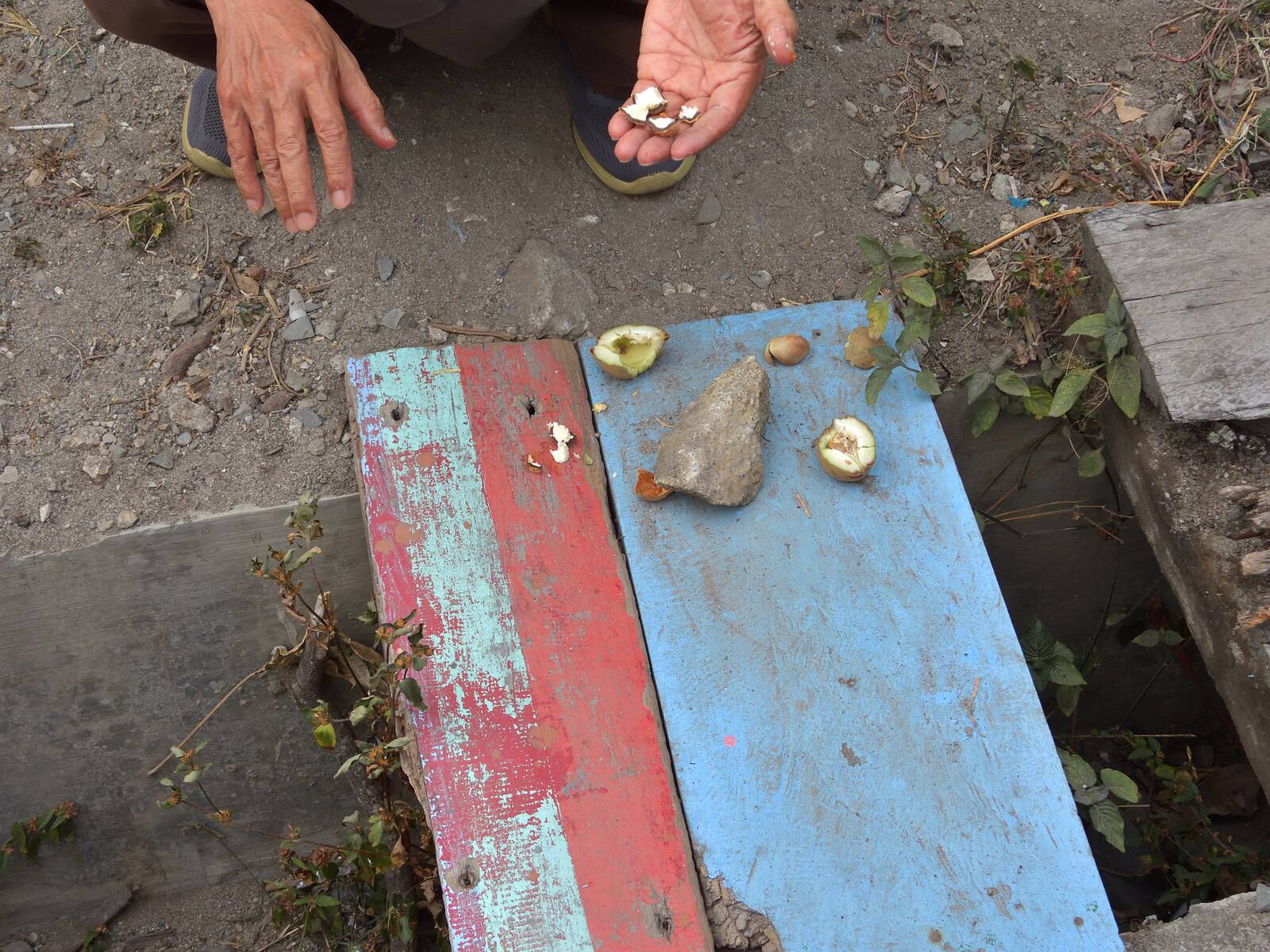 Unser Reiseleiter Rahmad zeigt uns eine sogenannte Kerzennuss. Die Kemirinuss vom Lichtnussbaum hat einen Ölgehalt von ca. 60 %. Man kann sie anzünden und dann brennt sie wie eine Kerze mit ruhiger Flamme.