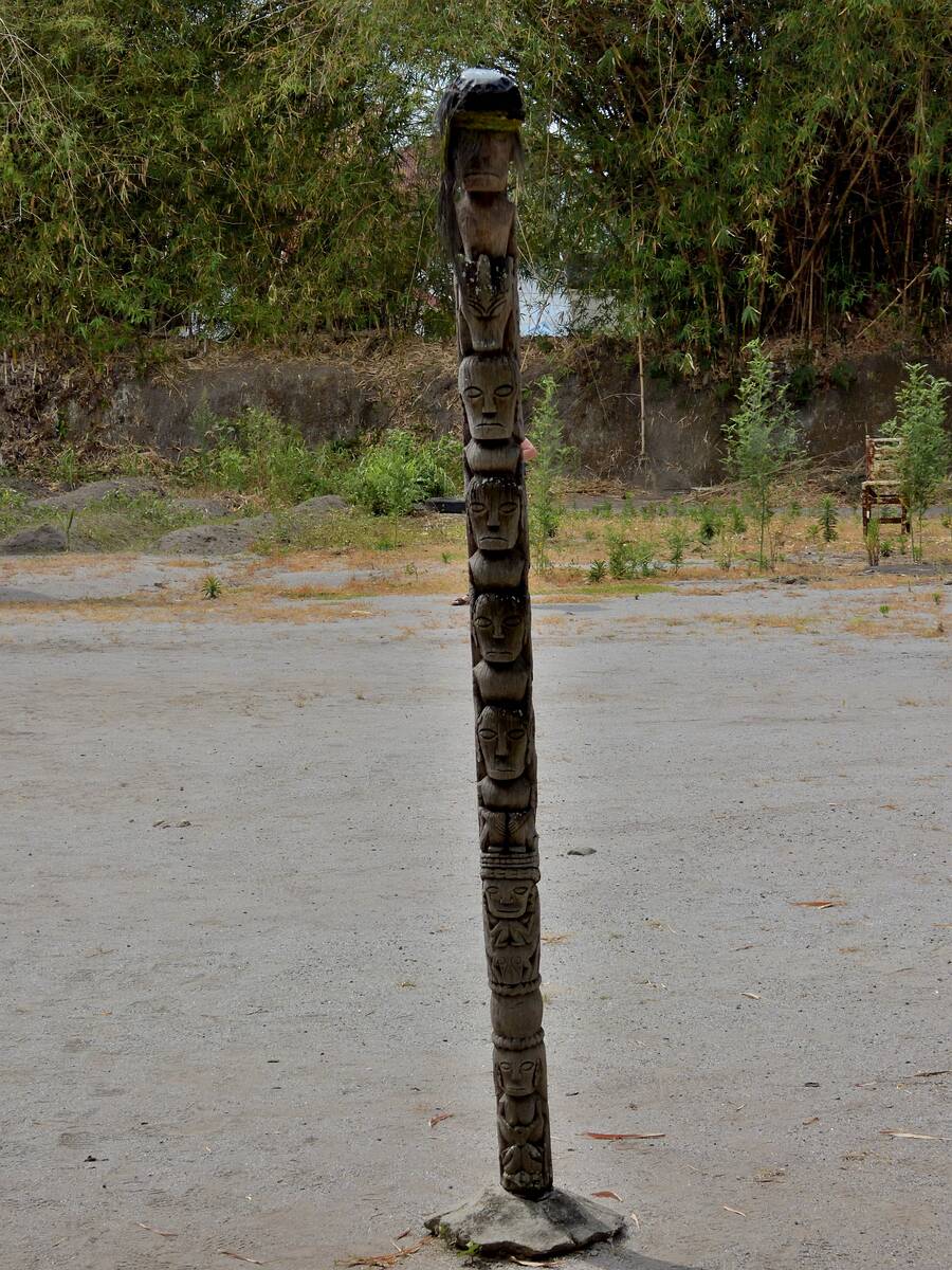 Am Dorfplatz steht ein Opferpfahl, der bei rituellen Zeremonien verwendet wurde.