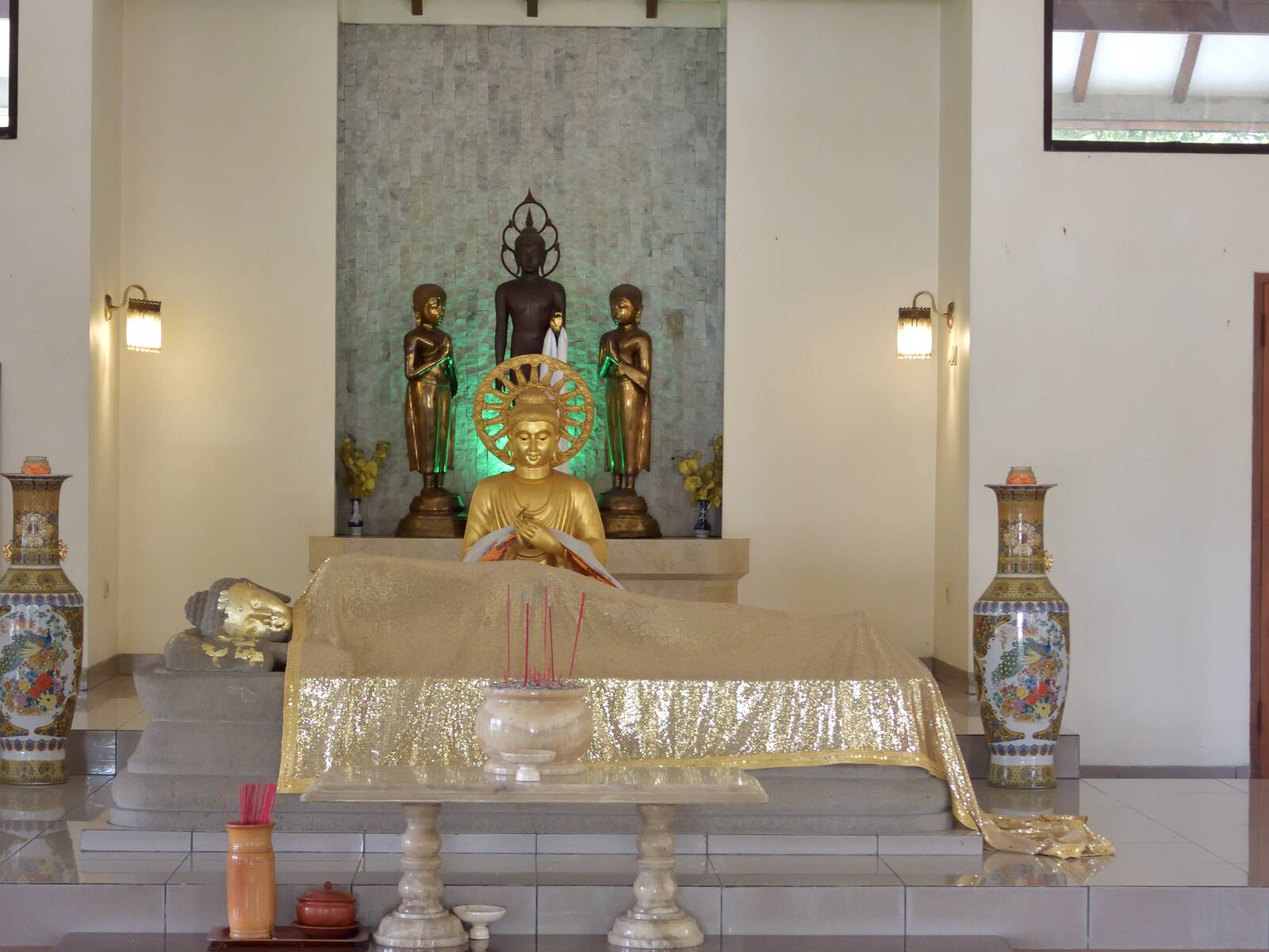 Die Gebetshalle des Mendut Buddhist Monastery. Vorne der liegende Buddha Siddhartha Gautama im Moment seines Übergangs ins Parinirvana (Tod), dahinter der sitzende Buddha (Vairocana), der das Rad der Lehre in Gang setzt. Ein Zusammenspiel von Abschied und ewiger Lehre.