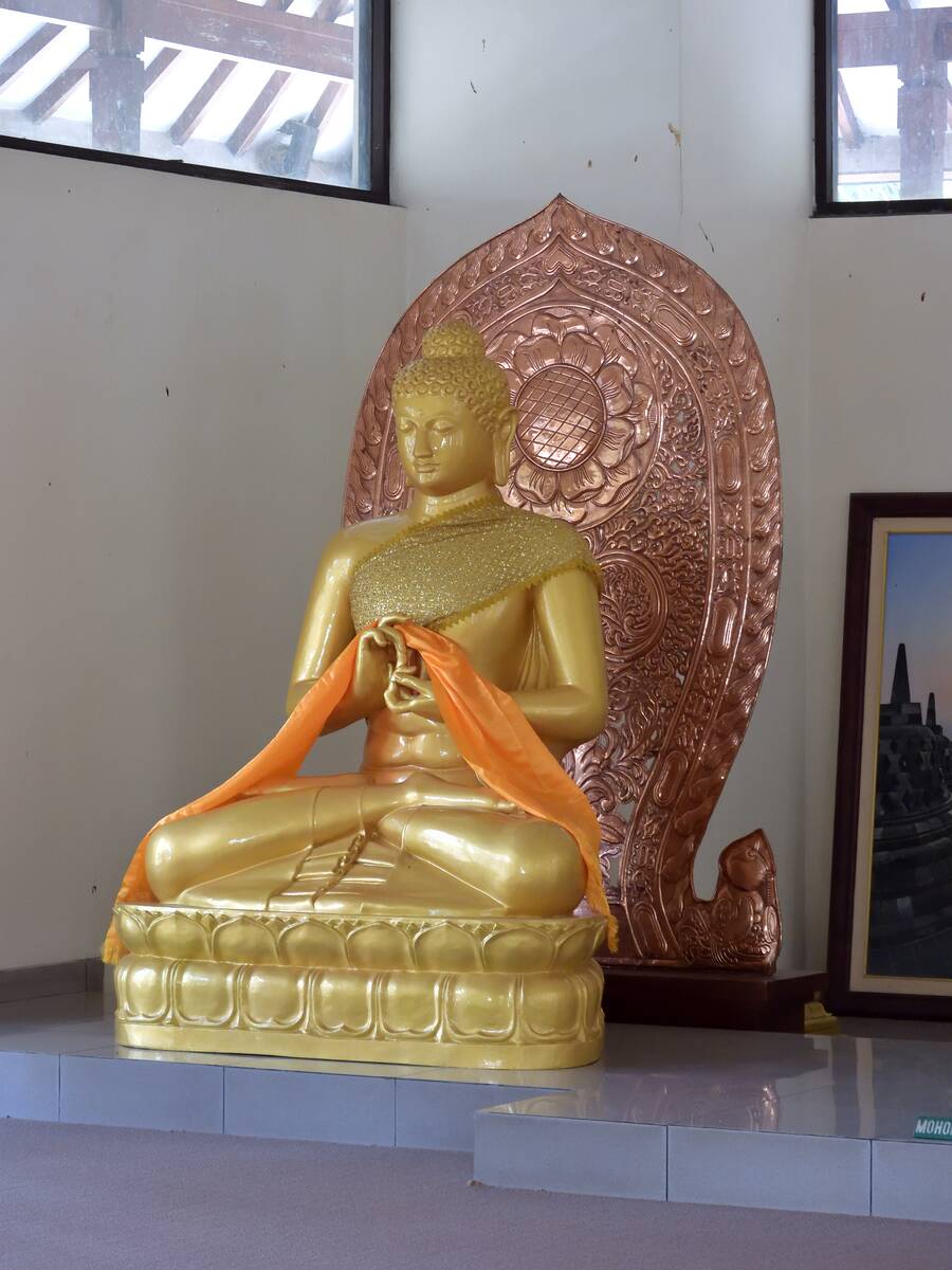 Avalokiteshvara (Padmapani) – der Bodhisattva des Mitgefühls. Er trägt die goldene Schärpe des mönchischen Gewandes. Seine Hände formen die Dharmachakra-Mudra: die Geste, die das Rad der Lehre in Gang setzt. Für ihn ist die Lehre das höchste Geschenk des Mitgefühls, um alle Wesen vom Leiden zu befreien.