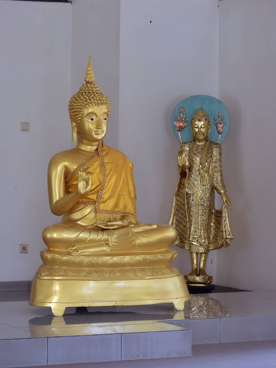 Der dritte im Bunde: Bodhisattva Vajrapani. Er verkörpert die spirituelle Kraft und Entschlossenheit, die nötig ist, um den Weg der Erleuchtung zu gehen. Als Beschützer der Lehre zeigt er die Vitarka-Mudra – die Geste der Diskussion und Unterweisung. Sie symbolisiert den intellektuellen Austausch und die Weitergabe der Weisheit, durch die alle Zweifel besiegt werden.