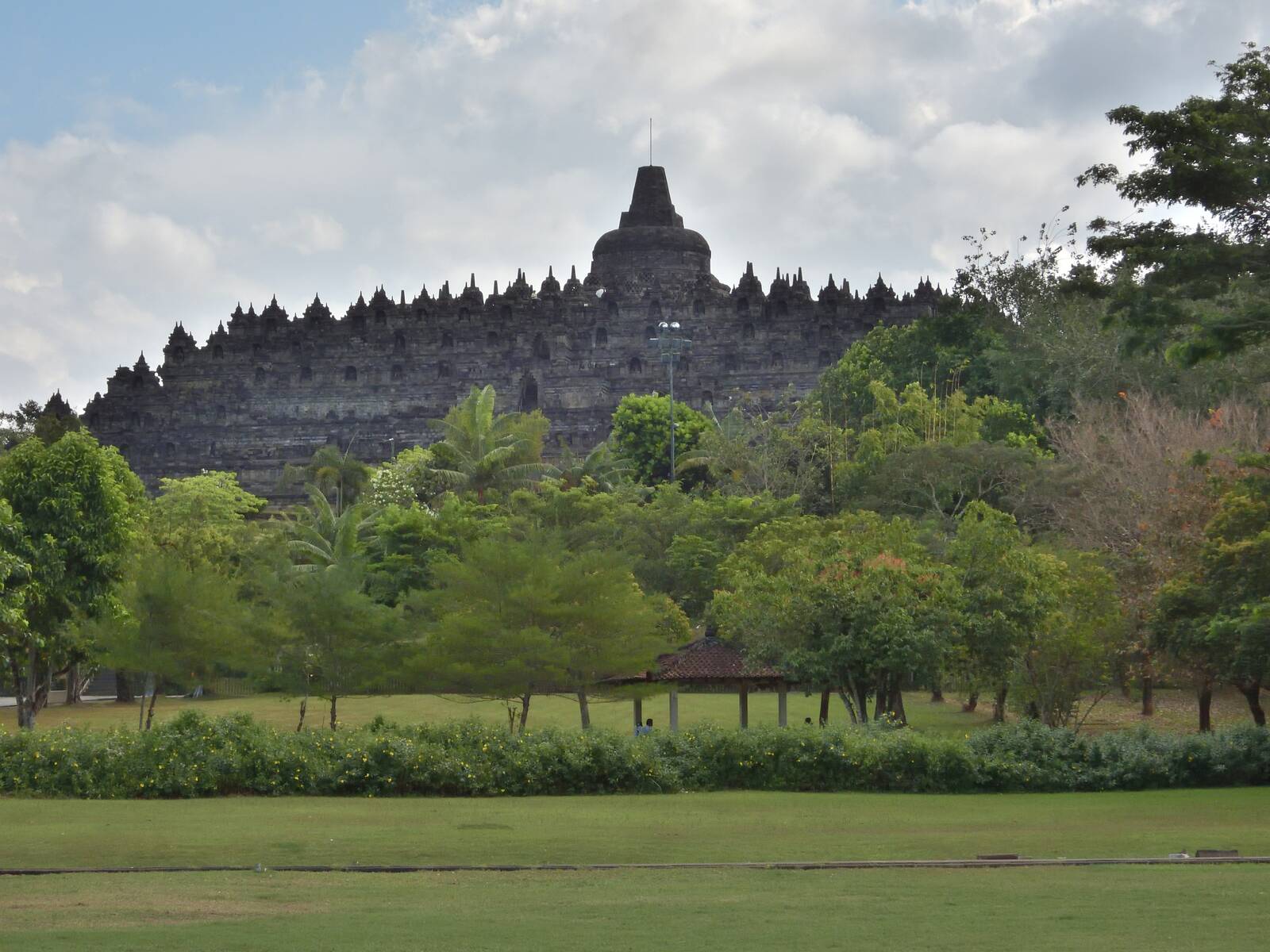 Unser erster Blick auf den kolossalen pyramidenförmigen Stupa.