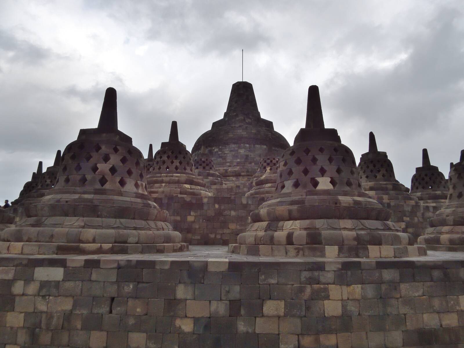 Diese Stupas umrahmen den Hauptstupa, der einen Durchmesser von fast 11 Metern hat.