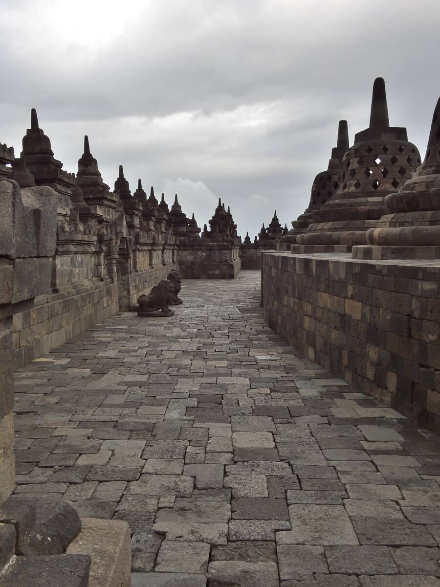 Die Wege auf den kreisförmigen Terrassen führen um den gesamten Stupa herum.