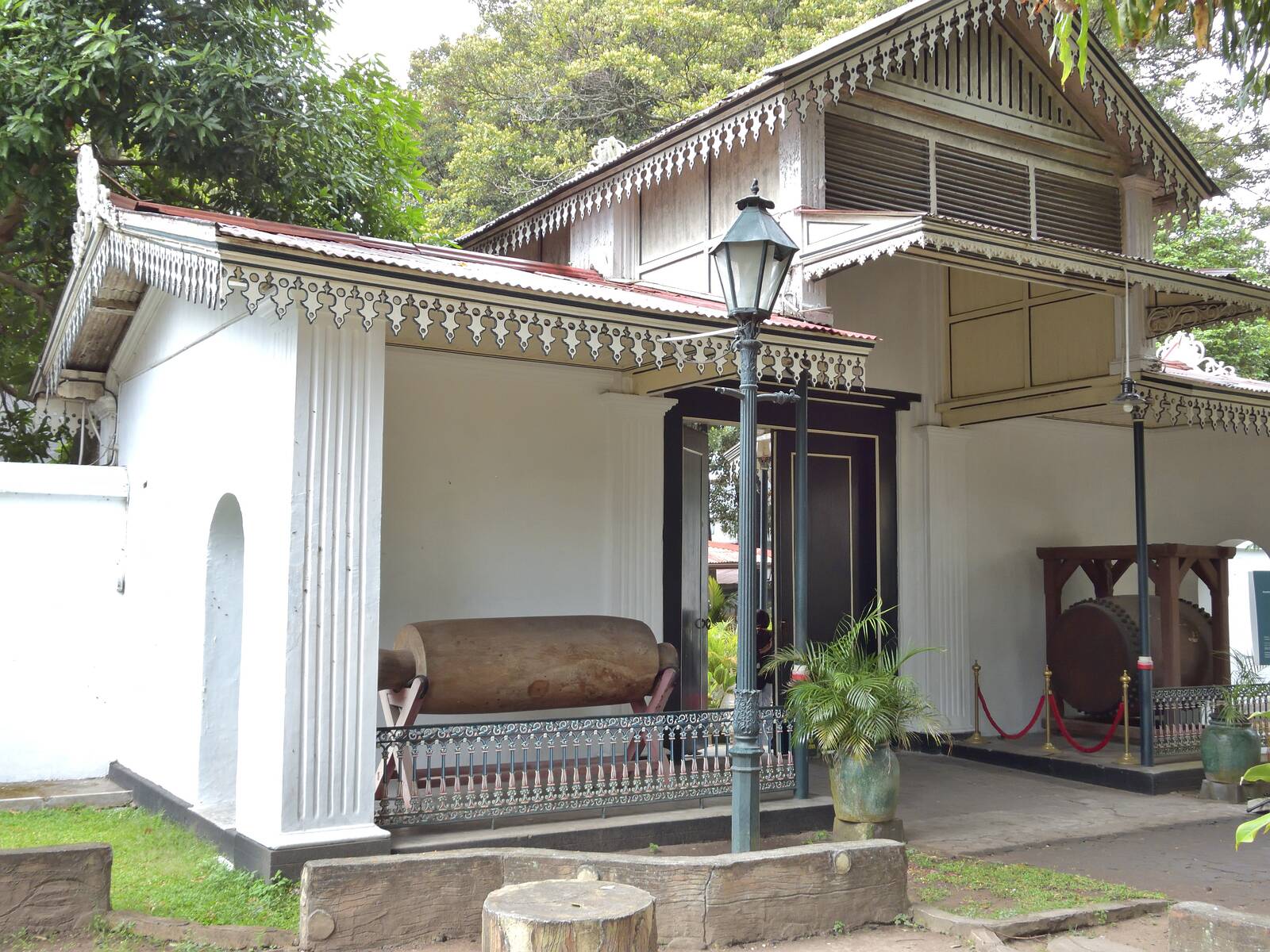 Links ein Kentongan bzw. eine Schlitztrommel. Sie wurde historisch als Kommunikationsinstrument oder Warnsignal für die Bewohner des Kraton-Viertels verwendet. Rechts eine Moscheetrommel oder Bedug.