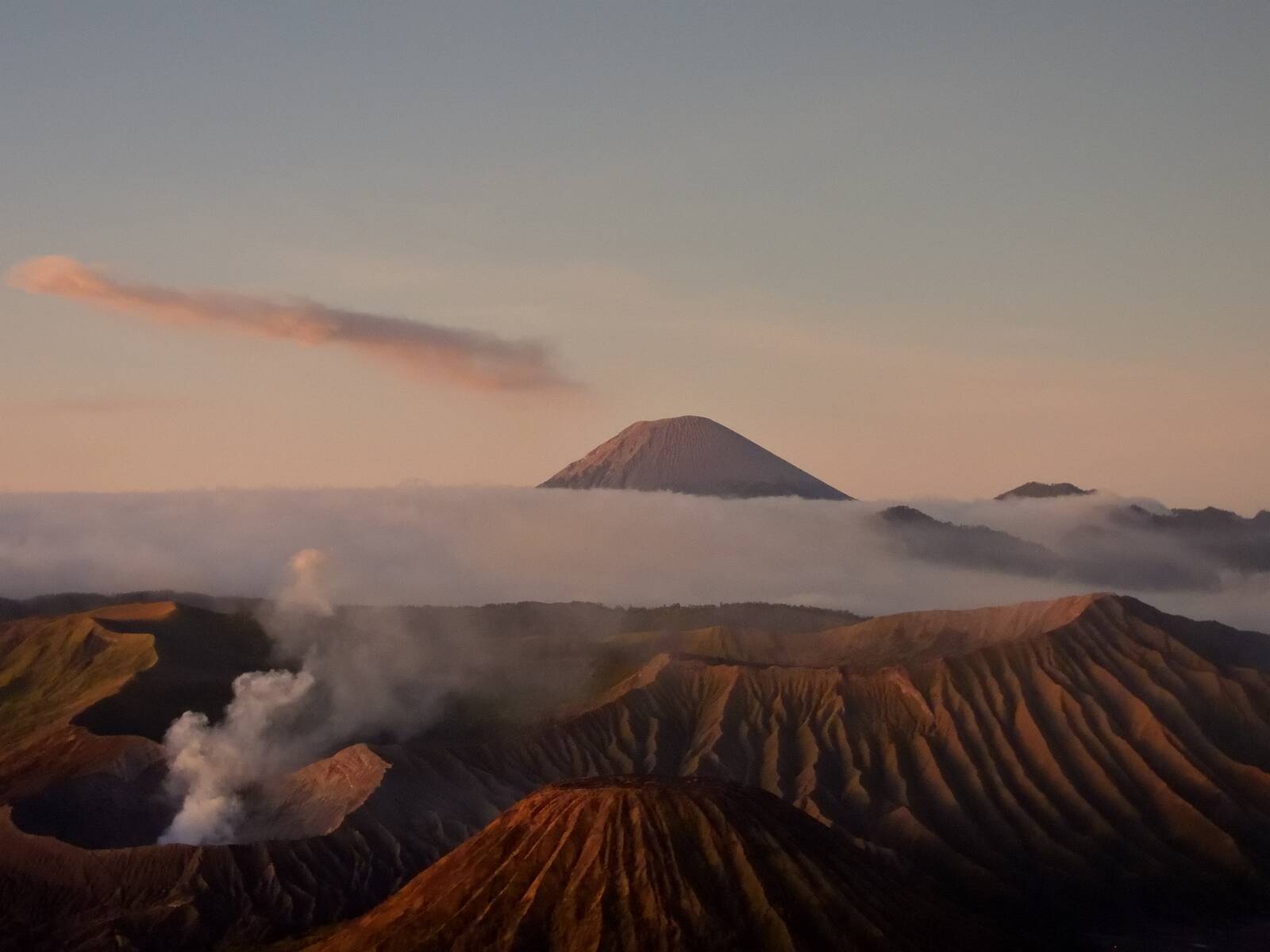 Der Blick umfasst eine riesige vulkanische Ebene, die morgens oft in Nebel gehüllt ist.