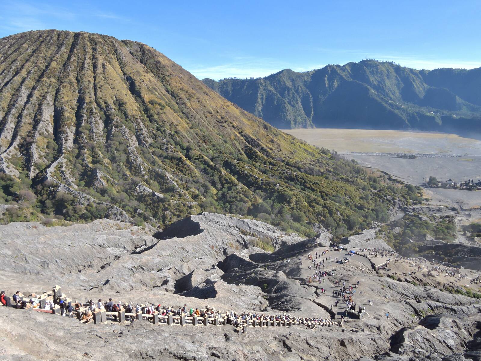 Die Caldera entstand vor rund 10.000 Jahren nach einer massiven Eruption. Das Becken füllte sich im Laufe der Jahre mit vulkanischem Material. Jetzt gehen wir die Stiege hinunter und weiter durch den Lavasand zurück zum Jeep.