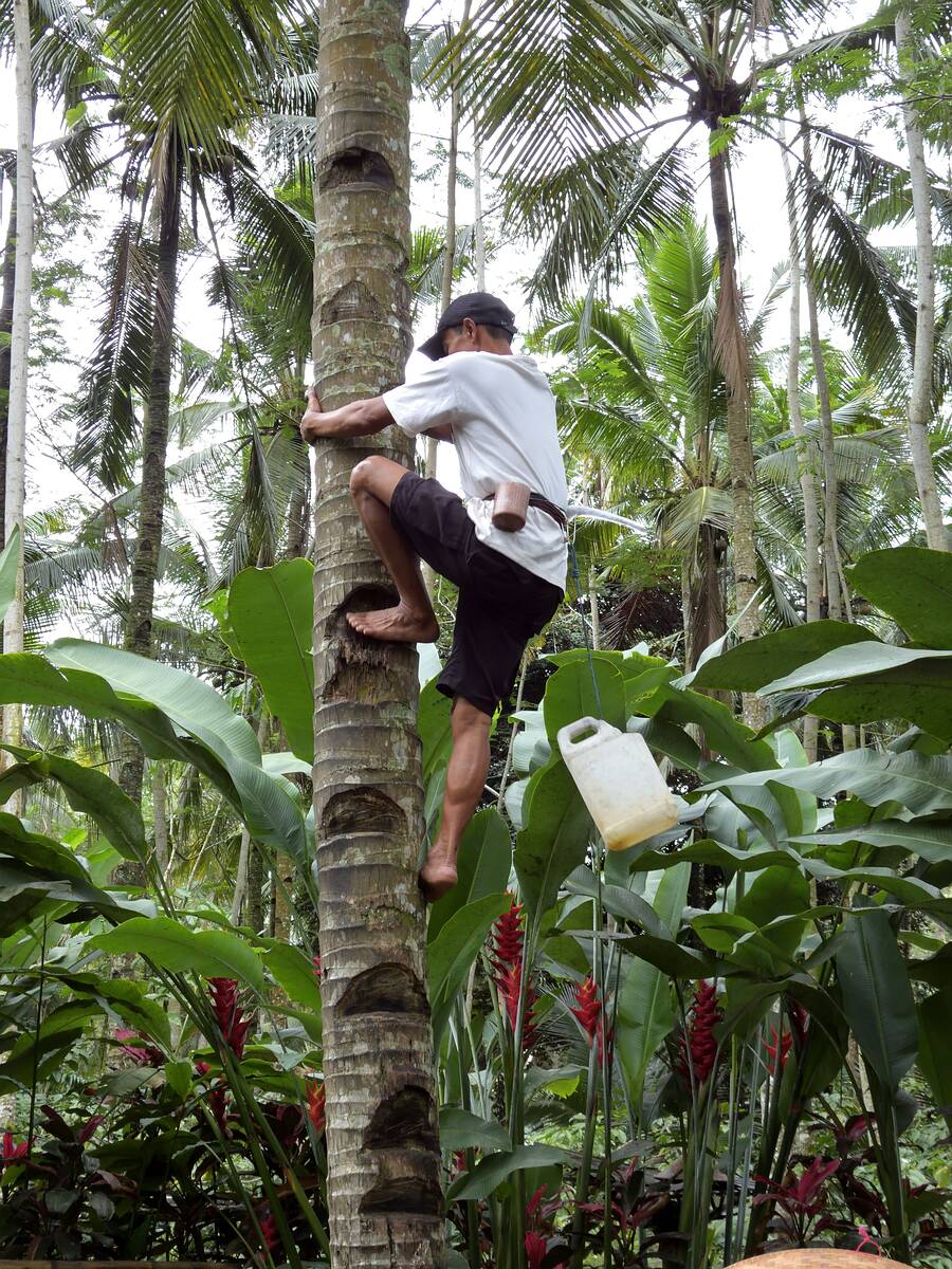 Hier wird uns gezeigt, wie Palmsaft von der Kokospalme geerntet wird.