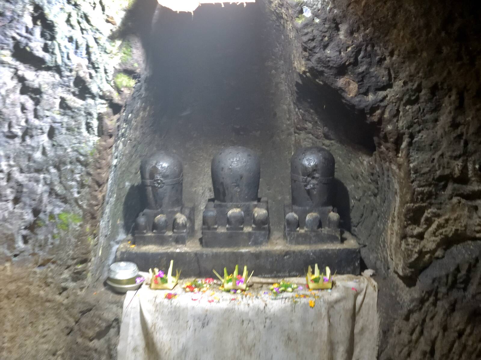 Drei steinerne Lingams. Das sind Symbole für den Gott Shiva.