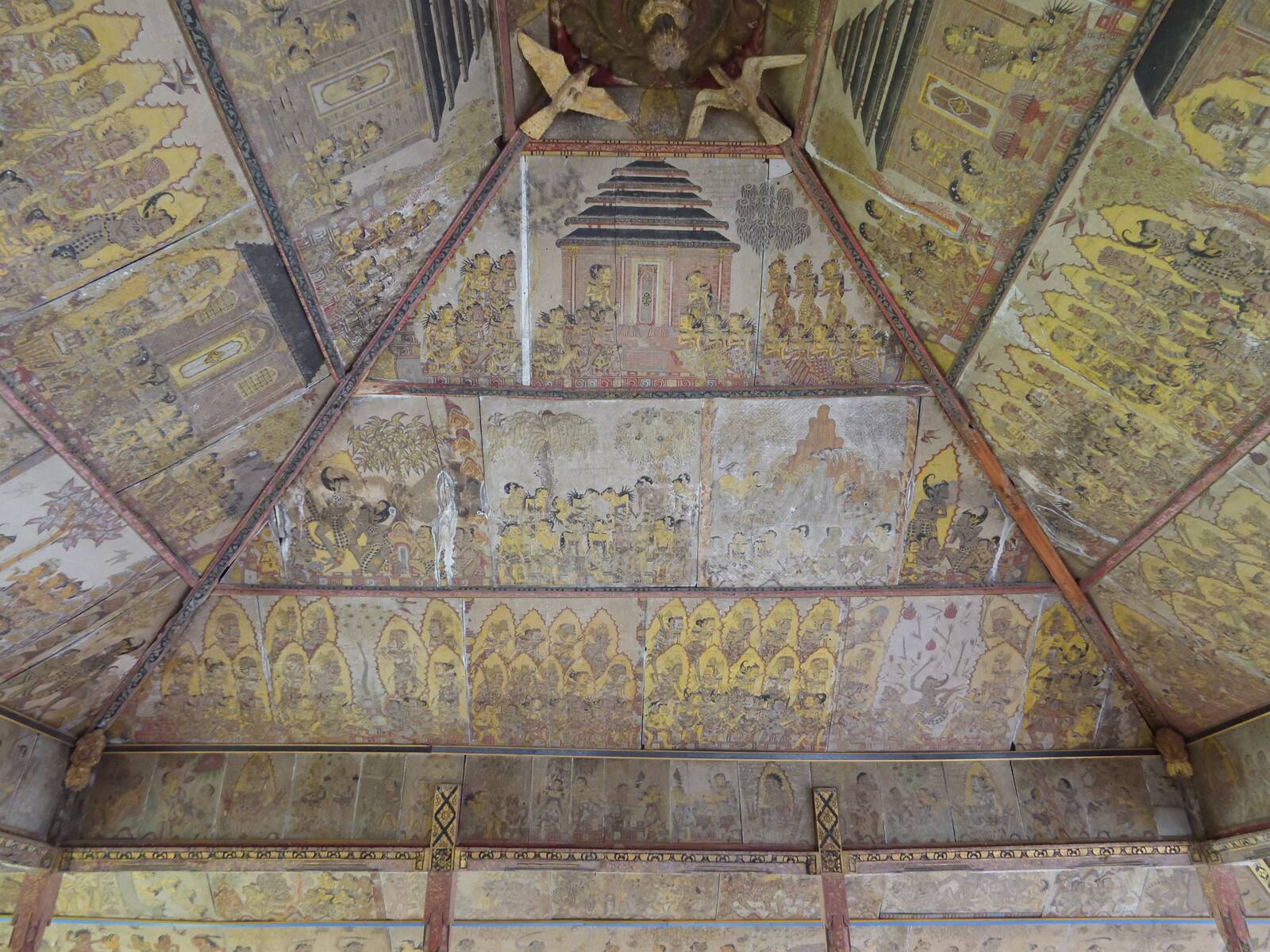 Die kunstvollen Malereien an der Decke im traditionellen Kamasan-Stil. Sie zeigen in mehreren Ebenen Szenen aus hinduistischen Epen wie dem Mahabharata. Besonders eindrucksvoll sind die Darstellungen von Bima Swarga (die Reise der Seele durch die Unterwelt), die die drakonischen Strafen für verschiedene Sünden illustrieren – eine visuelle Warnung für die Angeklagten, die auf ihr Urteil warteten. Die grausamen Darstellungen sollten die Angeklagten zur Wahrheit bewegen.